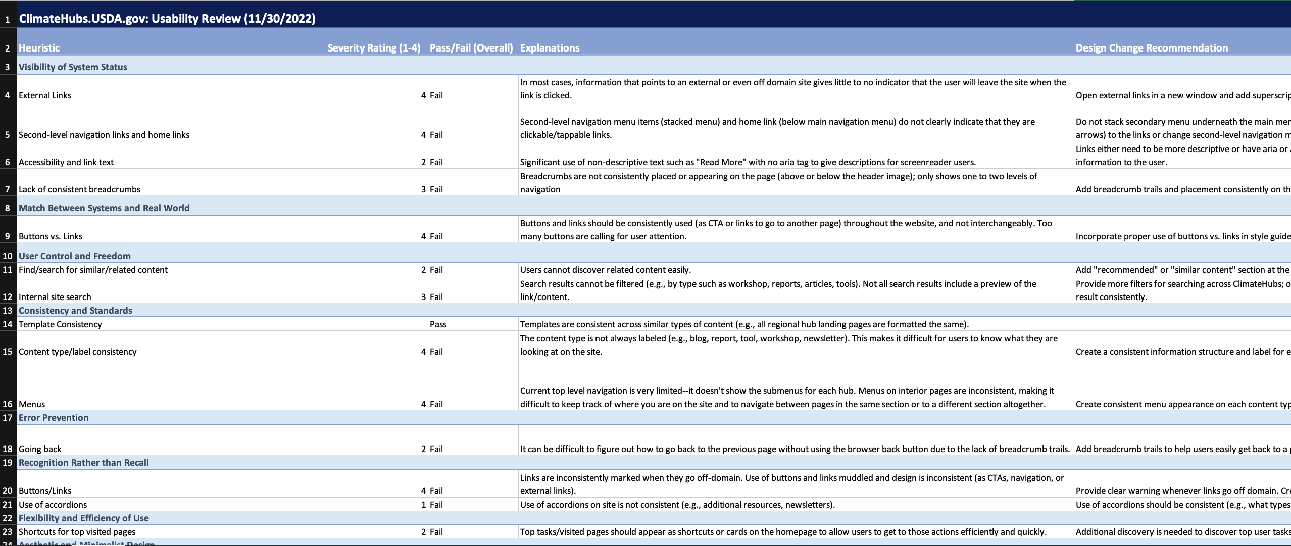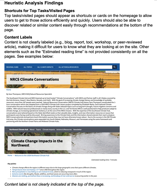 - I collaborated closely with content strategy to analyze and present research findings and recommendations based on our discovery activities. For example, it includes the heuristics analysis findings. The survey data was not included here due to its late launch on the Climate Hubs website.