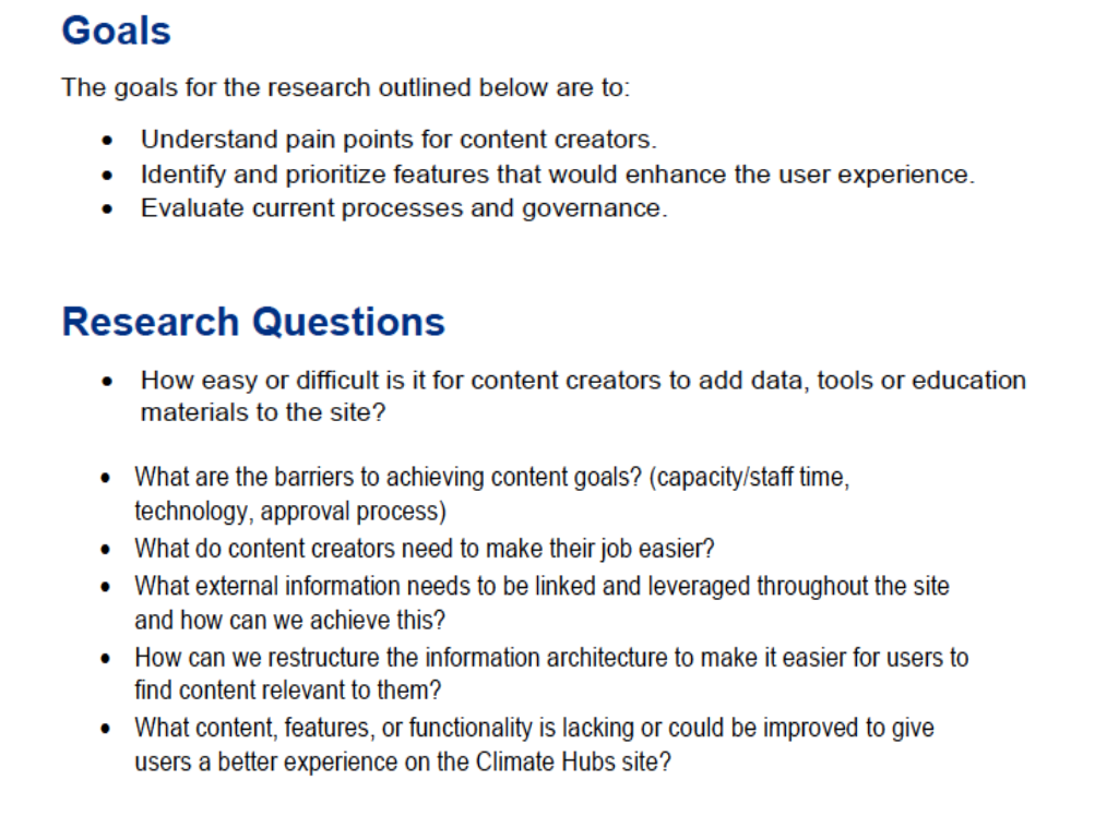 - We identified user needs that were not able to be met by the agency at this time due to website constraints. For example, requests were made to look into adding a Spanish language translation feature to the site (for the Puerto Rican population). There was also a desire for web tools such as Agrisk and Grasscast that are currently hosted externally to be added to the Climate Hubs website.
