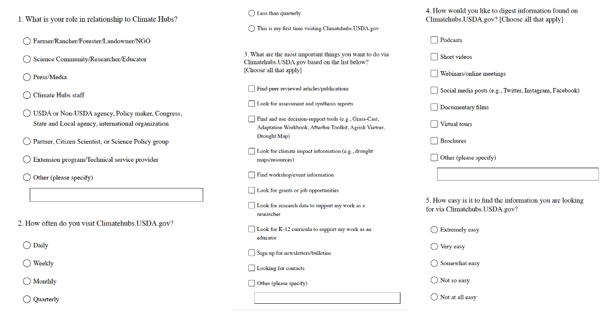 - I created a survey using Survey Monkey to measure user perceptions of the current site. The survey was posted on the Climate Hubs homepage.